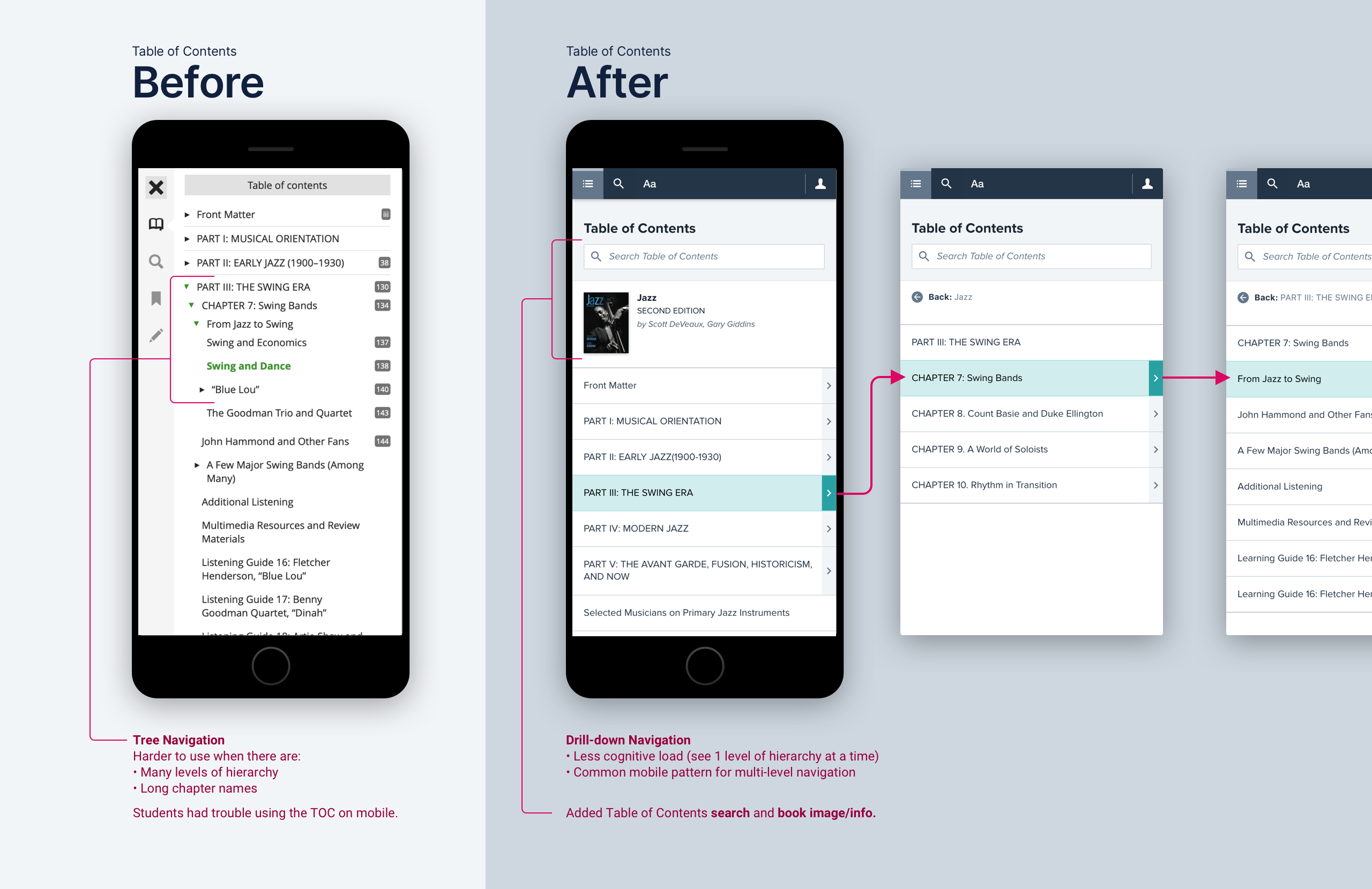 This had many design implications. For the Table of Contents panel, it informed our decision to go with a drill-down menu instead of the original tree navigation.