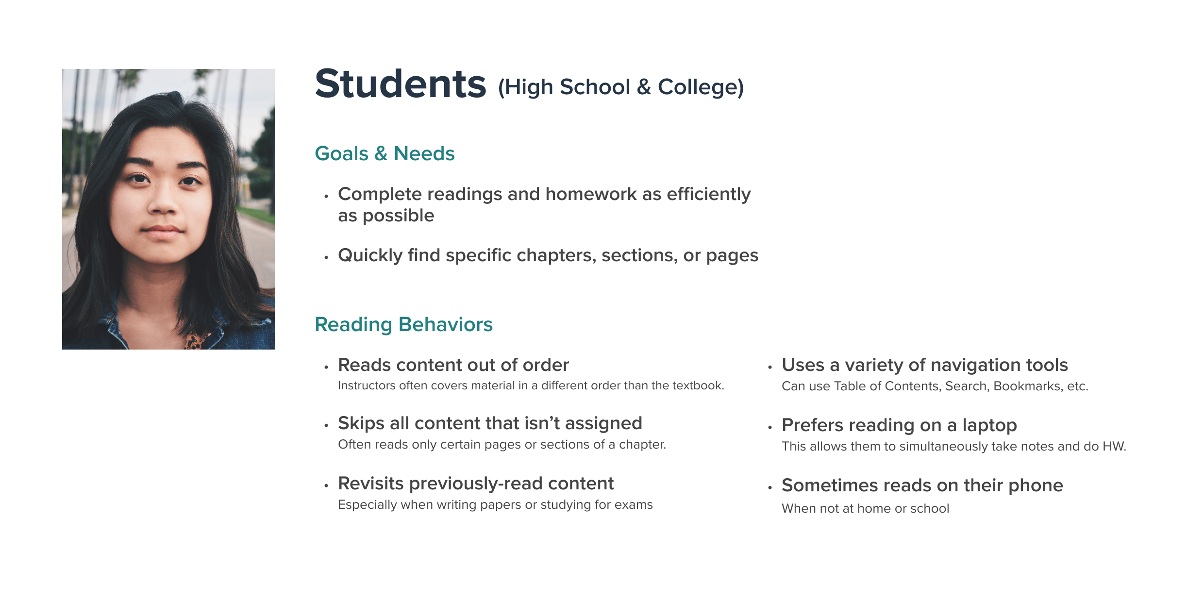 Textbooks have complex information architectures compared to standard novels and nonfiction books. NERd users also have specific reading habits and goals, relying heavily on navigation tools to find the content relevant to their coursework.